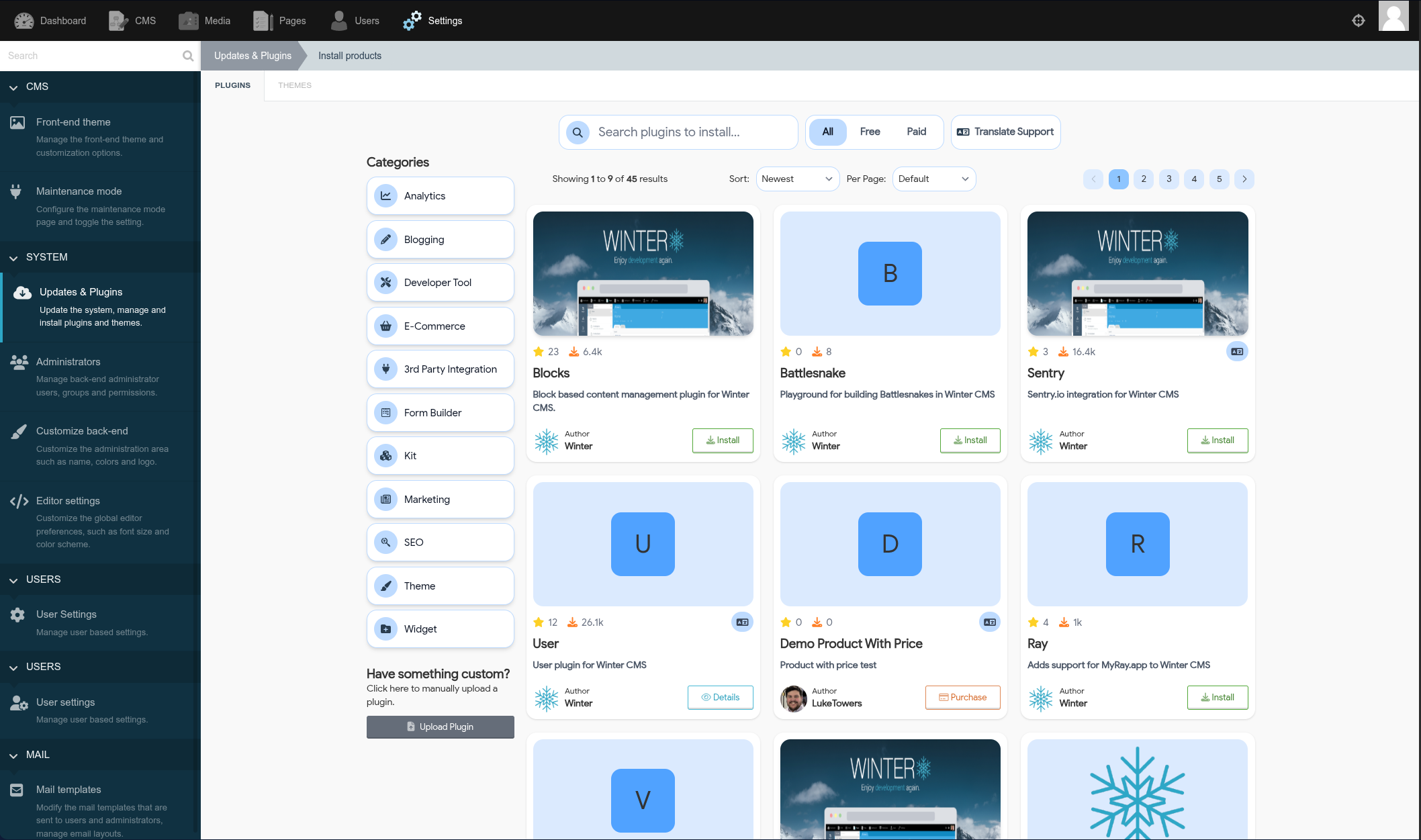 We are hard at work developing the official Winter CMS Marketplace, to provide a one-stop shop for all your themes and plugins on your Winter CMS projects. While we hope to have this available soon, don't fret, we also provide a couple of other options for plugin and theme installation.